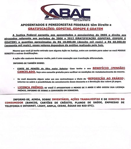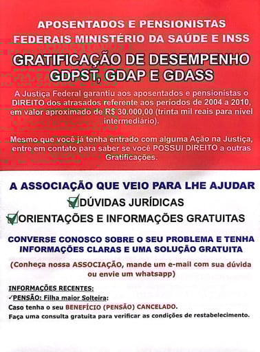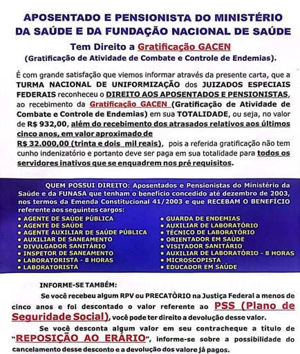 APOSENTADOS E PENSIONISTAS SERVIDORES FEDERAIS TEM VARIOS DIREITOS E NA MAIORIA DAS VEZES NÃO SABE. INFORMAÇÕES SOBRE GRATIFICAÇÕES DE DESEMPENHO, COMO GDATA, GDPGPE, GDPGTAS, GDATEM, GDASS PARA OS MINISTERIOS DO Exército, Marinha, Aeronáutica, Transportes, e funcionários do INSS. MUITOS APOSENTADOS E PENSIONISTAS FEDERAIS AINDA TEM DIREITO A AÇÃO REFERENTE AOS 28,86% E NÃO CONHECEM SEUS DIREITOS. SERVIDORES PÚBLICOS ATIVOS OU APOSENTADOS NOS ÚLTIMOS 5 ANOS PODEM PEDIR A CONVERSÃO EM DINHEIRO DA LICENÇA PREMIO NÃO USUFRUIDA. A Justiça Federal garantiu aos Aposentados e Pensionistas do MINISTÉRIO DA SAÚDE e da FUNASA o DIREITO, ao recebimento da Gratificação GACEN (Gratificação de Atividade e Combate e Controle de Endemias) em sua TOTALIDADE,